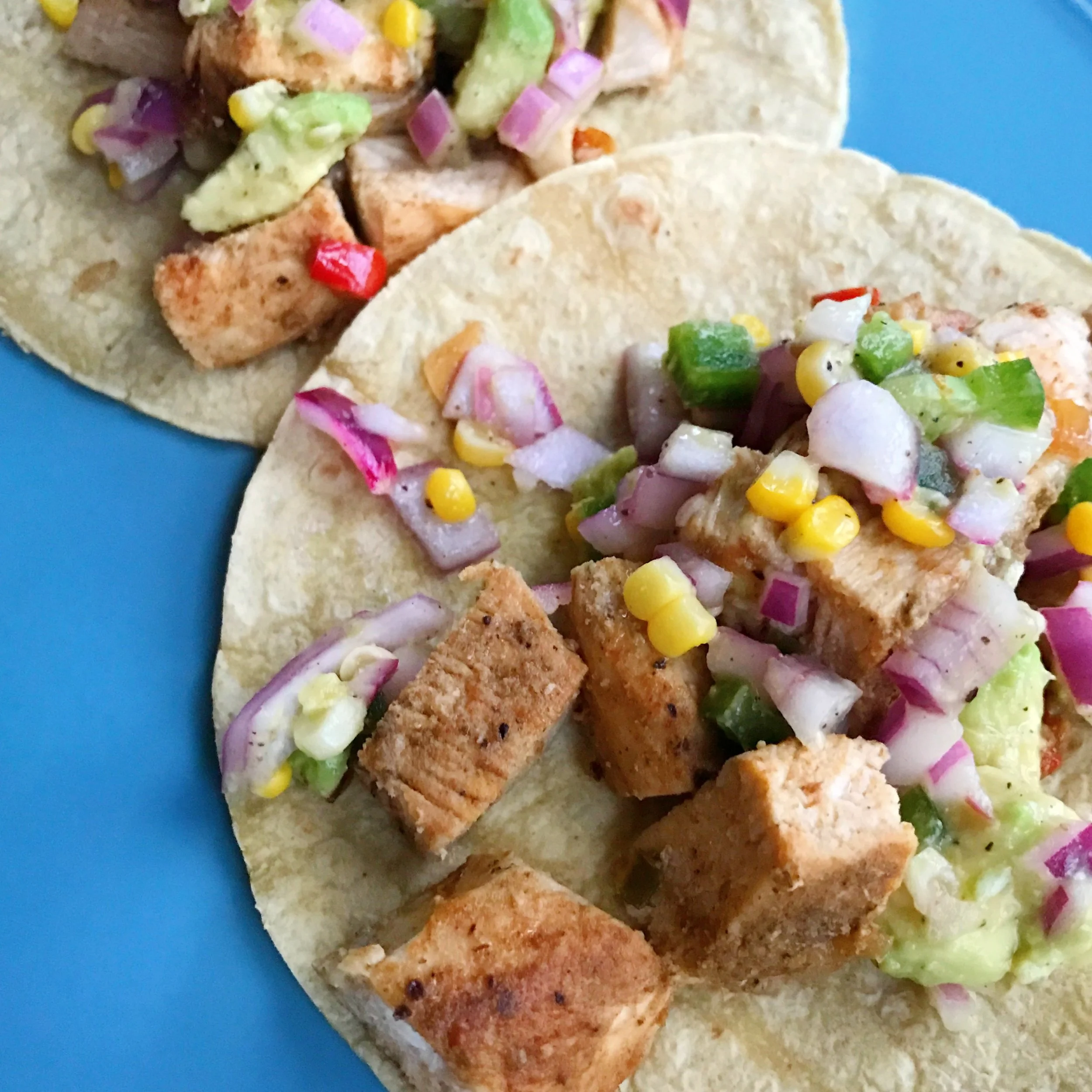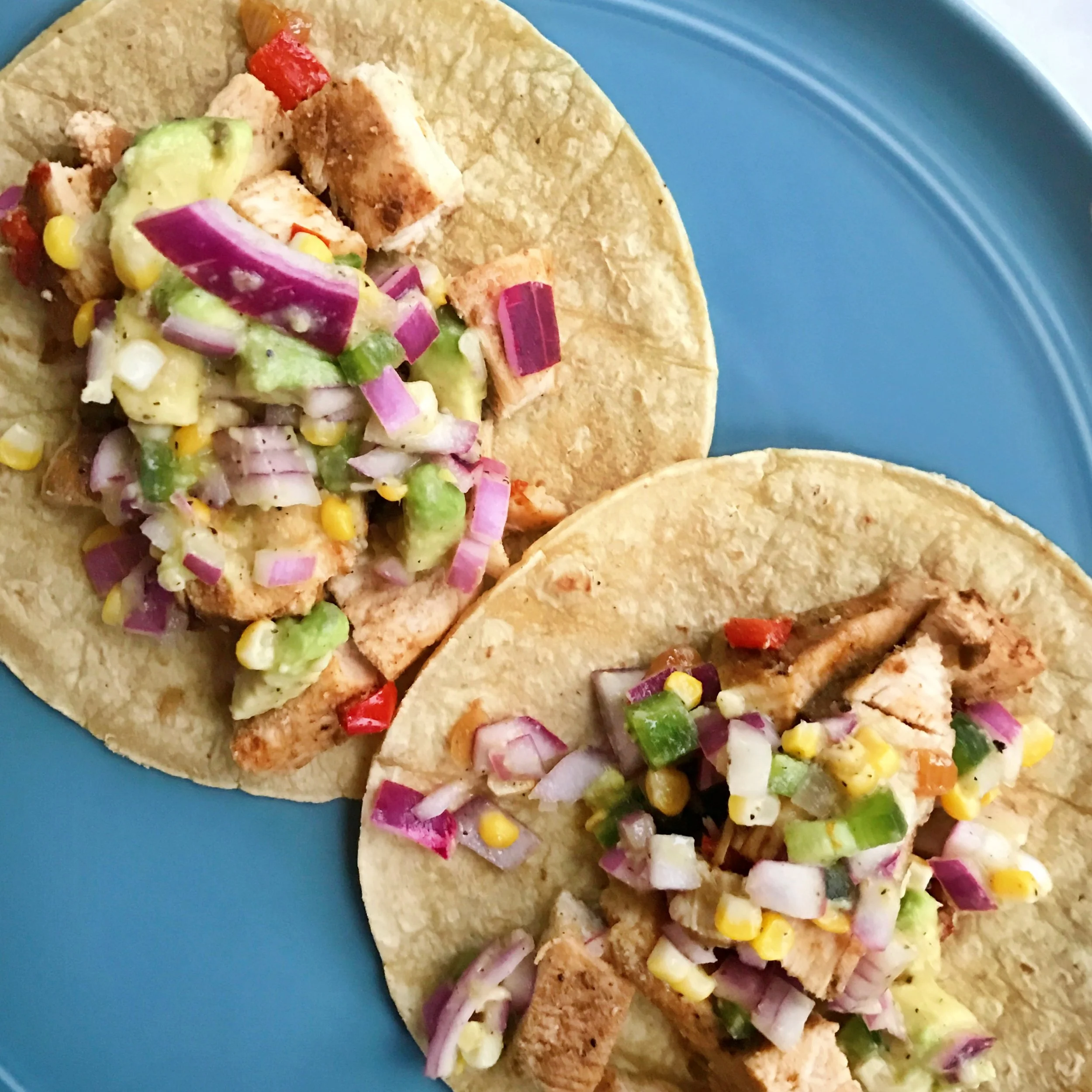 Once everything is done, load up your chicken mixture into a tortilla and top with avocado corn salsa and EAT UP!!